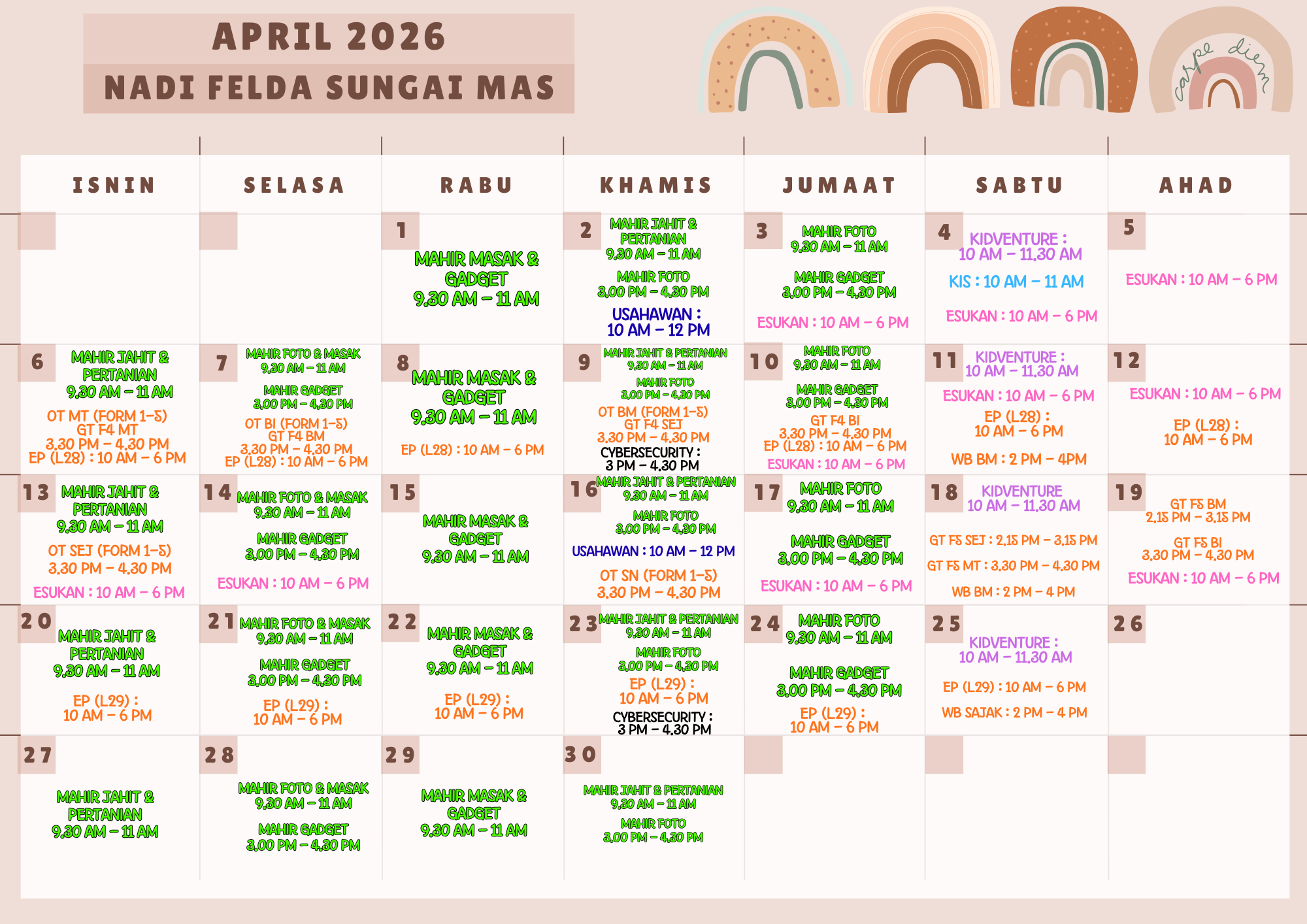 Tarikh 12 Februari 2026 (Khamis) Masa 3.00 – 4.30 petang Lokasi NADI Felda Sungai Mas Peserta 3 orang Tujuan Kebaikan / Kelebihan Aktiviti Gambar Disini